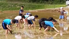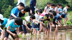 田んぼは,はるか遠くまで見渡せる高台にあり,気持ちのいい風が吹いていました。4年生以上の児童たちは経験者。慣れたものです。中でも,6年のS君や5年のSさんは,すごい早さで植えまくりでした。反面,初めての体験という3年生たちは,おっかなびっくり(上中央写真)。他の学年児童がどんどん進む中,なかなか進むことができませんでした。(他学年児童たちが一列植え終わった頃,まだ数歩しか進んでいなかった!)来年,先輩面できるでしょうか?児童たちが植えた広さは,およそ300㎡(3アール)。180kgほどのお米(コシヒカリ)が収穫できるだろうとのことでした。秋の収穫(稲刈り)が楽しみですね。