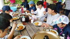朝は,野外炊飯。奥先生にお世話になり,2グループに分かれ,カレーライスを作りました。みんな,手際がとてもよかったです。海岸で食べる食事は最高でした。カレーには,グループによって味わいに差があったようで,ソフト味とワイルド味がありました。先生方には,懐かしい「お焦げ」が人気でした。