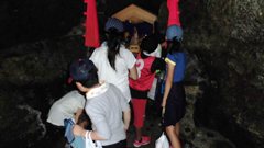 午後は,追跡ハイキング。午前に引き続き,奥先生にお世話していただきました。3グループに分かれ,自然の家を5分間隔で出発。所々にあるクイズを解きながら海岸線を4㎞歩き,赤崎灯台を目指しました。