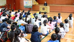 3・4年生がいる体育館に不審者が現れます。担任は,すぐに児童たちを職員室に避難させ,身を挺して不審者を引き止めます。そこに,3・4年生の報告を聞いた教頭が現場に到着,担任とともに不審者を引き止めます。その後,報告を受け,職員に,校内放送と警察・町教委への連絡を指示した校長,そして校務員,児童たちを職員室に避難(左写真)させた5・6年担任らが,次々に刺股(さすまた)を持って現場に到着。刺股を駆使し,不審者をその場に押しとどめます。(中央の写真は,保護者からいただいたものです。ありがとうございました。)遂には,津幡警察署の警察官が現場に駆けつけてくれたということにして,避難訓練は終了。児童たちの安全は守られました。(ちなみに,1・2年生たちは,内鍵をかけ,担任,応援に来た教頭とともに,1・2年教室にこもっていました。)保護者の方々の参観の下の訓練は,違う意味で緊張しました。