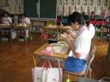 18日(火)の朝学習の時間に各学年担当が教室におじゃまして、「たいそうのおにいさん・おねえさん」となり、目と体をリラックスさせる体操のもはん指導を行いました。大きな古時計のオルゴールメロディーにあわせて、6年生がやさしい声で方法説明を録音したCDを毎週火曜日・金曜日に放送する予定です。