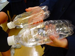 ↑ 6年理科 二酸化炭素は水に溶けるのでしょうか。二酸化炭素を入れて振ってみると、不思議な現象がおこりました。これは水に溶けたといえるのでしょうか。