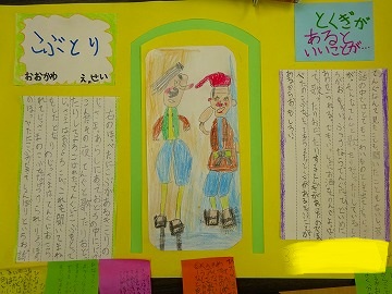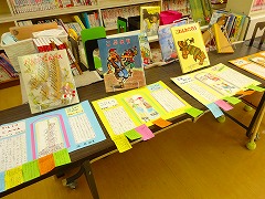 ↑ 図書館には、3年生の国語の学習で、「おもしいと思うところを、しょうかいしよう」で学んだことを生かして作った、紹介文が掲示されています。「おもしろい!」では、ズバリ、お話の中心になっているおもしろさを理由付きで紹介してあります。通知表渡し等でご来校の際は、ご覧ください。図書館に掲示してあります。