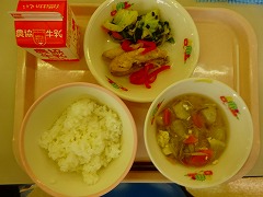 ↑ 今日の給食は、島根県メニューでした。宍道湖(しんじこ)のワカサギの南蛮漬けは、骨までやわらかくカルシウムたっぷりなうえに、トウガラシで体もポカポカ温まりました。トビウオのお団子の味噌汁も温まり、大人気でした。磯部あえは、野菜が苦手な人も、のりの磯の香りと合わさり、おいしくいただくことができました。島根県には行ったことはありませんが、とても身近に感じることができました。