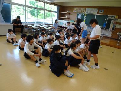 12日(水)に津幡警察署の方と不審者侵入訓練と防犯教室を行いました。1階12年教室に不審者が侵入したという想定です。子供たちは,落ち着いて行動し避難することができました。職員は不審者との対応訓練を実際に行いました。訓練後の津幡警察署の方による「防犯教室」では,不審者から声をかけられたら,はっきり「いやです。だめです。行きません。」と断るなど「いかのおすし」の具体的な話や不審者に遭遇した時に大声を出したり,逃げたりする練習をしました。自分で自分を守ることが大切だと教えていただきました。