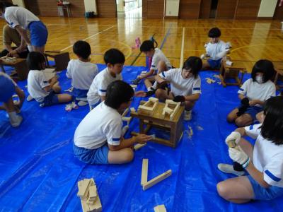 こども森の恵み推進事業として,県央森林組合の方,林業研究会の方をお招きして学習をしました。まず,「杉・あて・ひのき」などの枝を実際に見せていただきながら木についてのお話や「里山」についてのお話を聞きました。その後,たてわりグループでひのきでひとり一台「木琴」づくりに挑戦しました。1・2年生は「ばち」をつくったり,3年生は切った木片にやすりをかけたりくぎを打ったり,4年生~6年生はのこぎりで木を切ったりしました。グループでとてもよく協力して作成できました。最後に自分で鍵盤を貼って完成です。さて,どんなの音色の木琴になったかな。