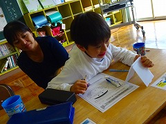 ↓ 1年生が「秋」を使って、わくわくパーティーのプレゼントづくりをしています。工夫をして、畑の先生に喜んでもらおうと、思いを込めて作っています。