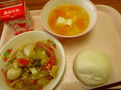 ↑今日の給食は、皿うどんと肉まん、珍しいメニューに大喜びです。