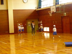 ↑体育 1.2年生 なんだか、「笠野の森探検」を体育館でしているようです。これらの運動には、いろいろなお話があるようです。