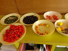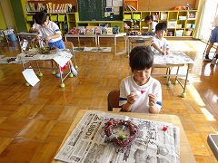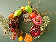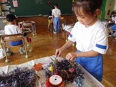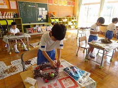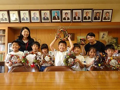 ↓ 1年生が育てたあさがおのツルでリースを作り、畑で育てた野菜や草花を乾燥させてリースに飾りました。色どりだけではなく、バーブの香りも楽しめます。育てて観察を楽しみ、リースを作って生活を楽しみました。出来上がったリースを校長室に見せに来てくれました。部屋中にハーブの良い香りが漂い、うっとり~いい気持ちです。