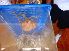 ↑ 1年生がやってきました。カマキリの説明で盛り上がっています。
