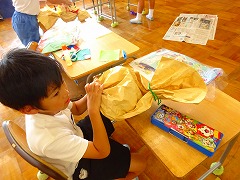 ↑ 2年生図画工作 「くしゃくしゃ、ぎゅっぎゅっ」紙でお友達をつくりました。どんなお友達ができたのでしょうか。完成が楽しみです。