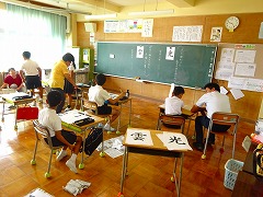 ↑ 3,4年生 習字の先生にゲストティーチャーとしてご指導を仰ぎました。力強く、太く、お手本を見ながら書くということを教えていただきました。個別にご指導戴けるので、筆遣いをしっかり学ぶことができます。