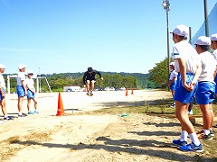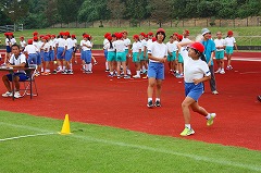↓ 6年生VS教員チーム対抗リレー 6年生は円陣を組んで、チームの士気を挙げています。我々教員チームも負けないわよ!