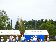 ↓ 紅白玉入れ かごを目指して、空高く紅白の玉が飛び交いました。