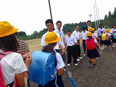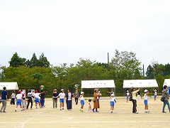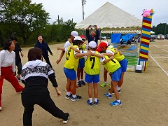 ↓ 6年生VS教員チーム対抗リレー 6年生は円陣を組んで、チームの士気を挙げています。我々教員チームも負けないわよ!