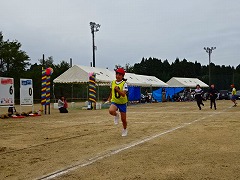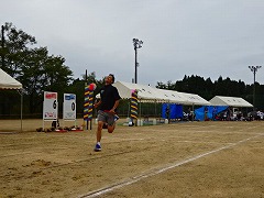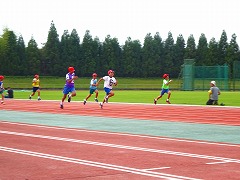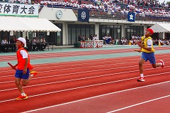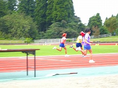 ↑学校対抗リレーは、3校のバトンと闘志を見事つなぐ力走で、タイムは2分11秒34でした。