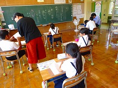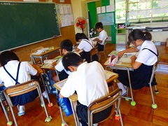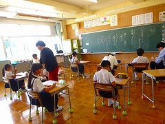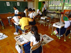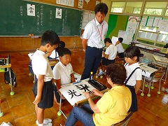 ↑ 3,4年生 習字の先生にゲストティーチャーとしてご指導を仰ぎました。力強く、太く、お手本を見ながら書くということを教えていただきました。個別にご指導戴けるので、筆遣いをしっかり学ぶことができます。