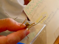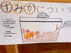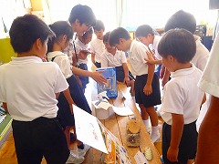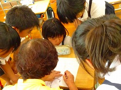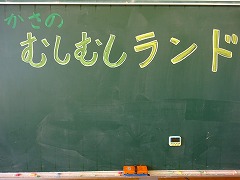 ↑ 1年生がやってきました。カマキリの説明で盛り上がっています。