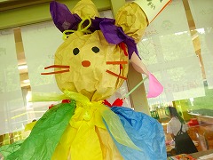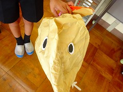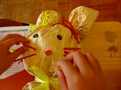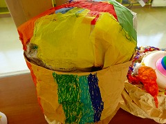 ↑ 2年 図画工作 くしゃくしゃにして、しばって、お友達の出来上がり!形が作れたら、さらにデコレーションして飾りを付けて、楽しいお友達にが出来上がりました。