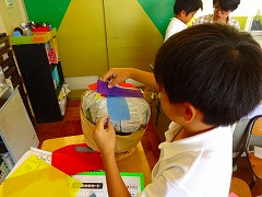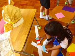 ↑ 2年生図画工作 「くしゃくしゃ、ぎゅっぎゅっ」紙でお友達をつくりました。どんなお友達ができたのでしょうか。完成が楽しみです。