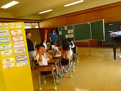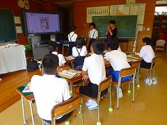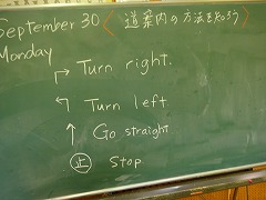 ↑ 6年生の外国語活動は、道案内です。Go straight. / Turn right.等ペアになって英語で道案内をしていました。right と left を間違えると、壁に当たることになってしまいます。