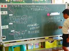↑ かけられる数が10倍になると、積はどうなるのか、調べていきました。かけられる数が10倍、100倍になると、積も10倍、100倍になることを見つけました。かけ算の仕組みについて学習しています。