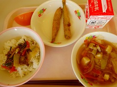 ↑ 塩分、糖分も控えめで、簡単で彩りよい料理が出来上がりました。子供たちは手際よく調理を進め、家でもきっとお手伝いをしているのだろうなあと思いました。食育の観点から、食事の過程のどこかで、子供が携わる部分があるとよいといわれています。(生産、食材の買い物、調理、配膳、後片付け等)これを機会に、食育をご家庭でも推進していただけたらと思います。お世話いただきました津幡町食生活改善推進員の皆様、PTA家庭教育部の皆様、会場を提供してくださいました笠野公民館様、ありがとうございました。