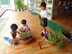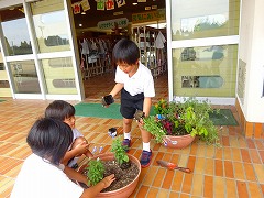 学校では、1年生が玄関の花苗を植える手伝いを進んでしてく入れました。