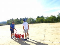 ↑ 全校競技玉入れの練習です。かごをねらって、たくさん入れていきましょう。