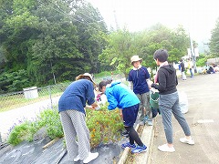 ↑ 高学年は学校に来る前に、笠野公園の花壇の草むしりをしました。地域の人に楽しんでもらおうと、みどりの少年団で4月29日に花苗を植えた花壇です。