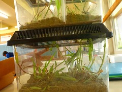 ↑ 3年理科 モンシロチョウの幼虫が、さなぎになりました!こちらの幼虫はまだ元気に動いてキャベツを食べています。さなぎの方は、全く動かなくなりました。