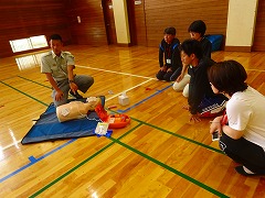 ↑ 1日目午後の活動は、予定通りカヌーの海洋活動です。チームの協力が試される活動です。うまく沖に出て、この場所に戻ってくることができるでしょうか。説明をしっかりと聞いています。