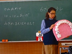 ↓ 親子歯磨き教室 歯科衛生士さんと町の保健師さんに、歯の健康を維持する方法と歯の磨き方を教わりました。