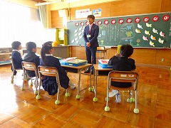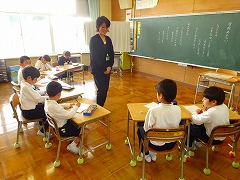 ↓ 入学式 教室で担任の先生と初めてのお勉強をしています。