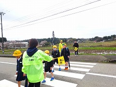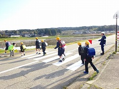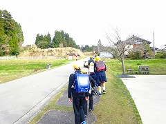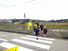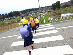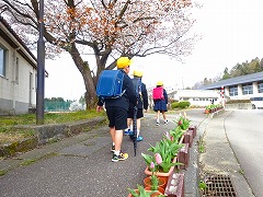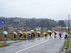 ↑ 雨の日も、風の日も、そして晴れの日もあります。上級生は1年生のペースに合わせて歩いていました。小さい子を思いやる優しさと上級生としての頼もしさを感じました。地域の皆様、見守りありがとうございます。