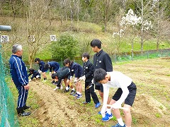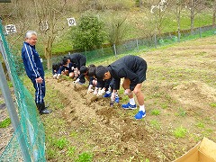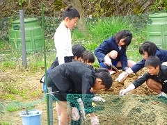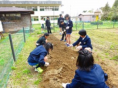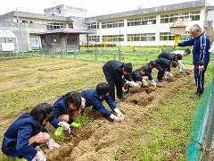 ↑ 6年生 理科 種芋から芽が出たジャガイモの苗を植える準備を進めています。