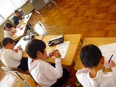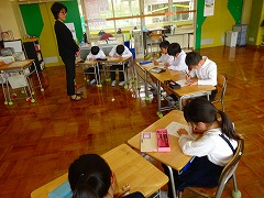 ↓ 2年国語 漢字練習です 書き順をしっかり覚えることも基本です。少人数ですから、空書きをしても、正しい書き順で書いているか一人一人確認できます。