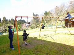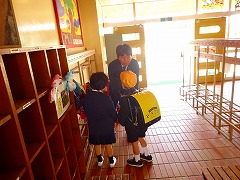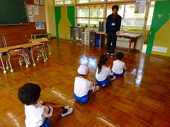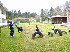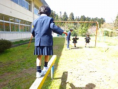 ↑ 1年生 今日の本は「こうちょうせんせい」が出てくるお話でした。タイミングよく私が教室に入ってみんなびっくりです。長休みは、大きなタイヤや高い平均台で元気に遊びました。
