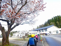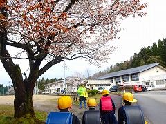 ↓ 桜の校門をくぐっての登校です。上級生は優しく下級生を見守っての集団登校です。
