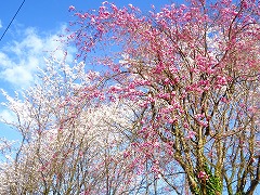 ↓青空のもと、桃色の桜、春爛漫の通学路です。