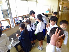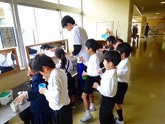 ↑食べた後は、みんなで歯磨き。3分間は一生懸命磨いてお口の中もさわやかです。