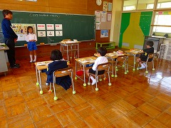 ↑ 1年生は勉強がスタートしています。この時間は算数で、ブロックと数字と、イラストを対応させて、数の概念を育てています。生活の中でも、たくさん数えてください。お皿でも、指でも、数字のカウントダウンでも・・・学校では意欲満々で、楽しく算数の学習をスタートさせることができてます。