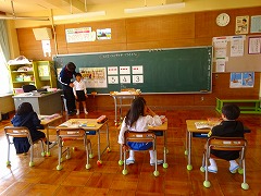 ↑ 3.4年の外国語学習です。今日は、外国の国の名前やあいさつの仕方、その国の文化について学びました。3年生も4年生もはっきりとした発音で、しっかり声を出してとても楽しそうでした。まずは、発音をまねて、どんどん話していきましょう。外国語活動では、3つの柱である①コミュニケーションへの関心・意欲・態度、②外国語根の慣れ親しみ、③言語や文化への気づきを中心に学んでいきます。