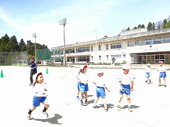 ↑ 1年2年 体育 折り返しリレー いろいろ変化をつけて工夫し、楽しくて運動量もたっぷりあるリレーです。見学者からは、応援歌があり、一そう盛り上がりました。