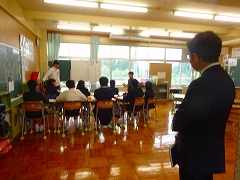 ↑3年生は算数の学習をしています。同時に4年生は同じ学級で算数の学習を進めます。担任は「渡り」といって、両学年を行き来して授業を進めます。担任は2学年分の準備をして授業に臨んでいます。いつも担任がついて進める授業ではありませんので、自分たちで考え、話し合う主体性がさらに必要とされます。複式学級なので致し方ありませんが、それを強みに変え、子供たちの自分から学ぶ力を育てています。これは、今求められている力なのです。