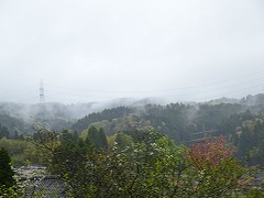 ↑ 朝から小ぬか雨で、遠くの山の景色は霞がかかったようです。
