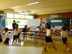 ↑ 1年生は入学して1か月が過ぎました。学校にもすっかり慣れてきました。休み時間、中庭でかくれんぼや鬼ごっこで楽しんでいます。