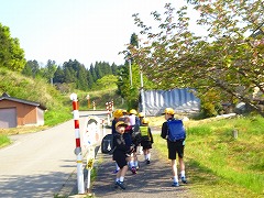 ↓ 桜の校門をくぐっての登校です。上級生は優しく下級生を見守っての集団登校です。