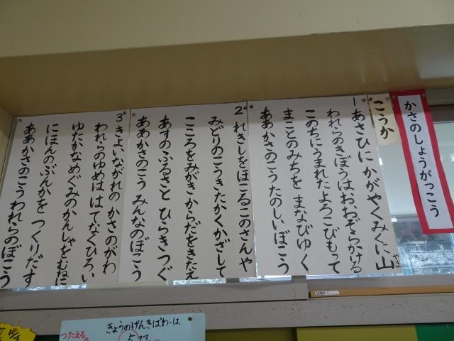 1年生の道徳の授業です。校歌にこめられた願いについて考えました。難しい言葉もある校歌の歌詞から,1年生なりに一生懸命考えました。「夢」「希望」「心をみがき体をきたえ」などの言葉を見つけ,こめられた願いについて発表しました。「三国山」「笠野川」「山野」「この地に生まれた喜び持って」などの言葉からは,自然豊かなこの地域を大切に思ってほしいという願いも伺えます。授業の最後には,みんなで校歌を歌いました。いつもより元気よく歌えました。